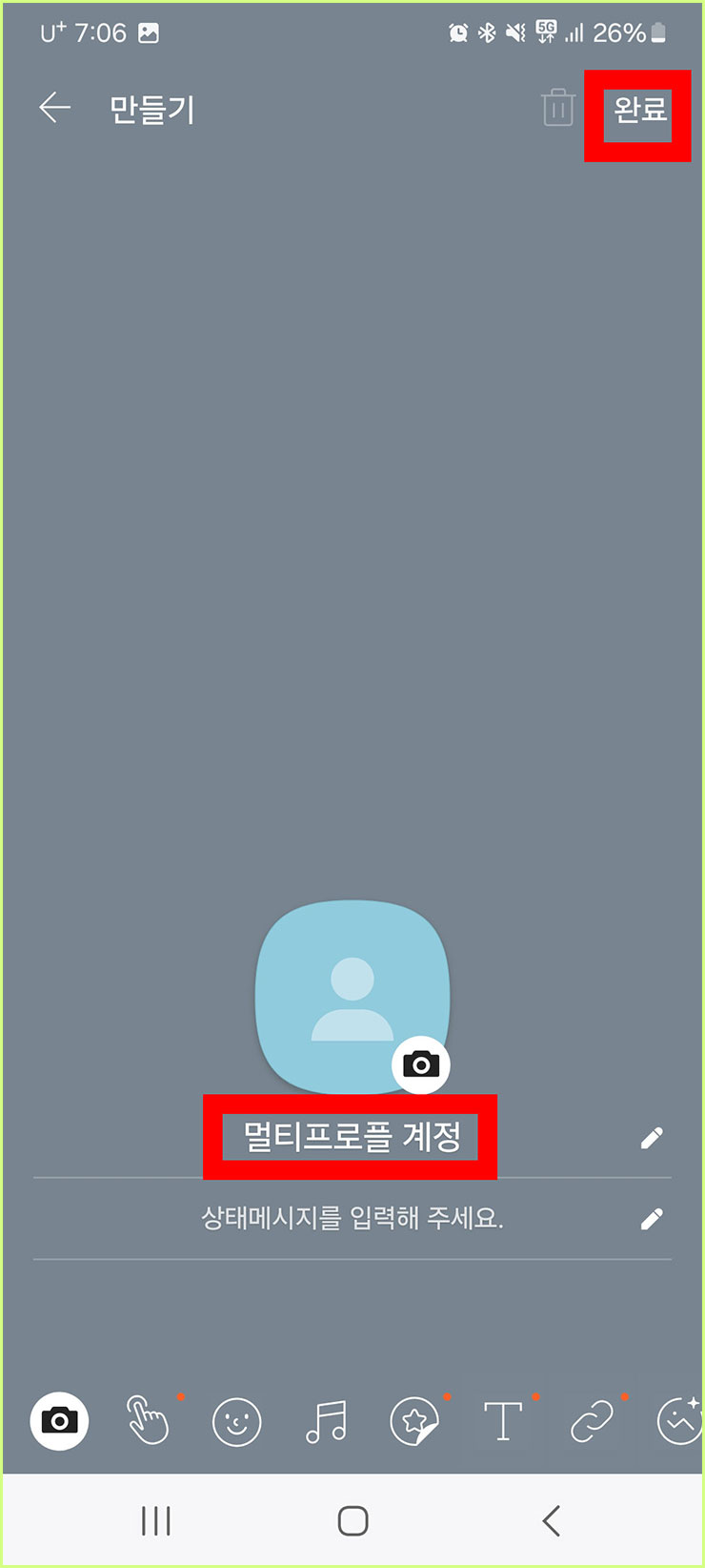 ■ 이름을 정했다면 오른쪽 위에 있는 [완료]를 클릭해주세요. 여기까지 카톡 멀티프로필 설정하는 것은 완료되었습니다.