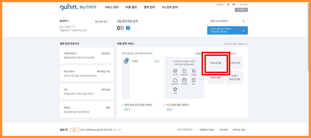 ■ 이제 여러분들의 DNS 관리툴에 들어가야 합니다. [MY 가비아 - DNS 관리툴] 순서로 가주세요.