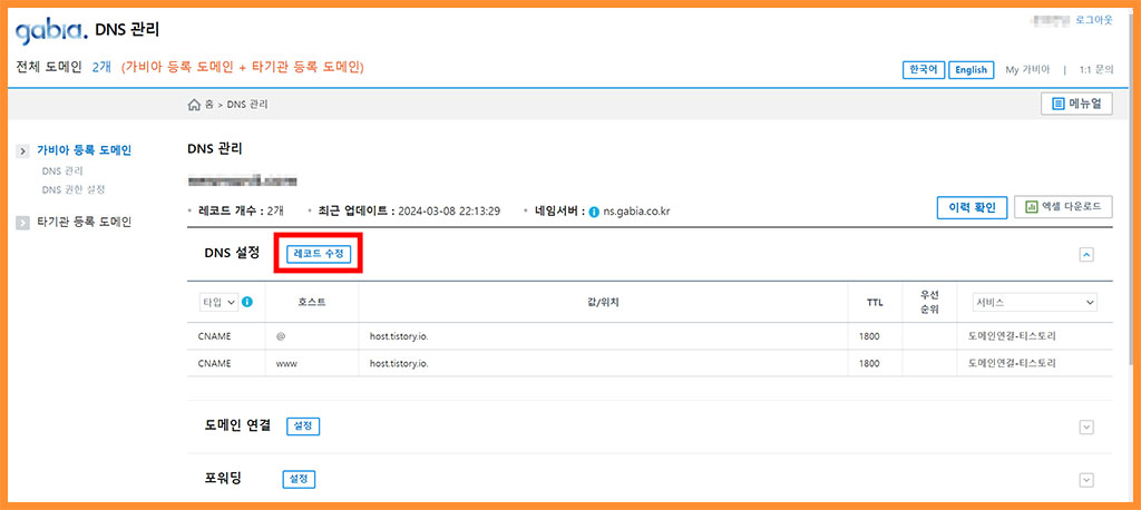 ■ 여기서 [설정 - 레코드 수정] 순서로 가주세요. 설정은 여러분들이 승인을 받았던, 혹은 메인 도메인으로 사용하려는 URL의 설정으로 가주셔야 합니다. 저처럼 도메인이 2개 이상인 분들은 잘 확인해서 설정 버튼을 눌러주세요.
