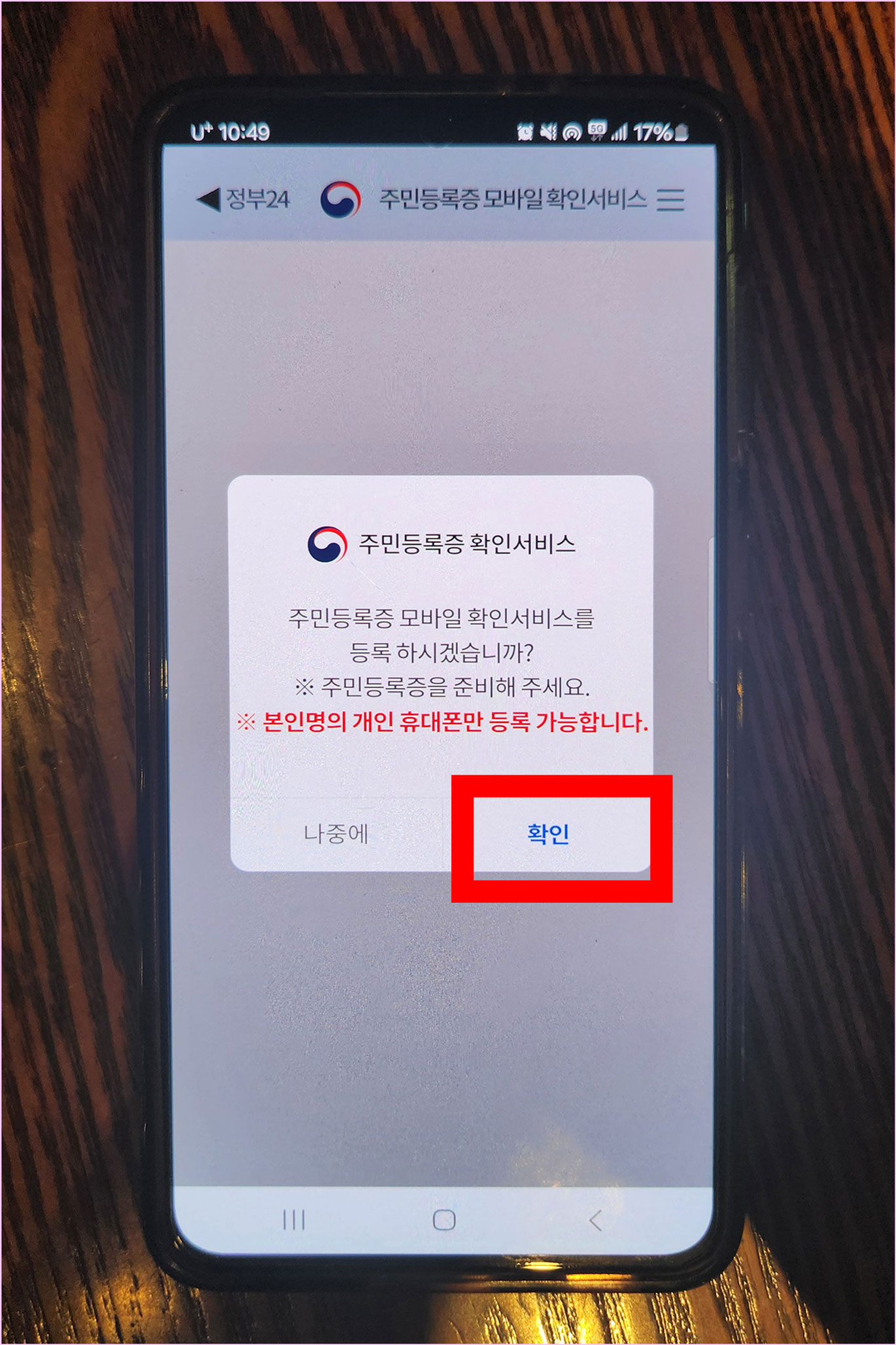 ■ 주의해야할 점은 모바일 주민등록증을 신청할 핸드폰이 여러분들의 폰이어야 합니다. 다른 사람의 폰으로 진행하시면 안 됩니다. 그 점을 유념한 상태에서 [확인]을 눌러주세요.