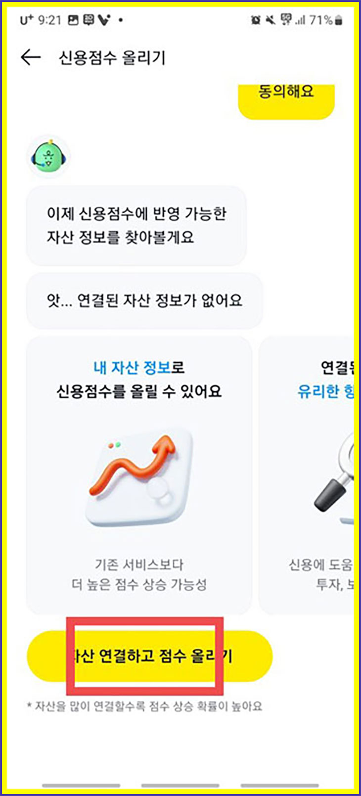 ■ 이제 자신의 자산 정보를 확인하기 위해서 [동의하고 점수 올리기]를 눌러주세요.