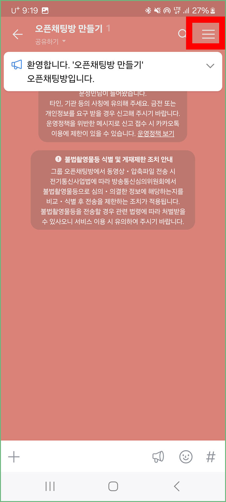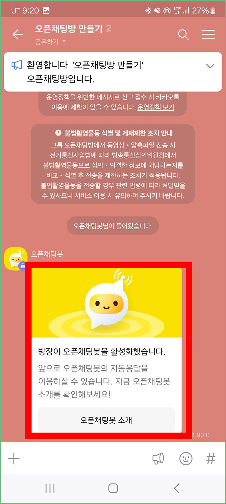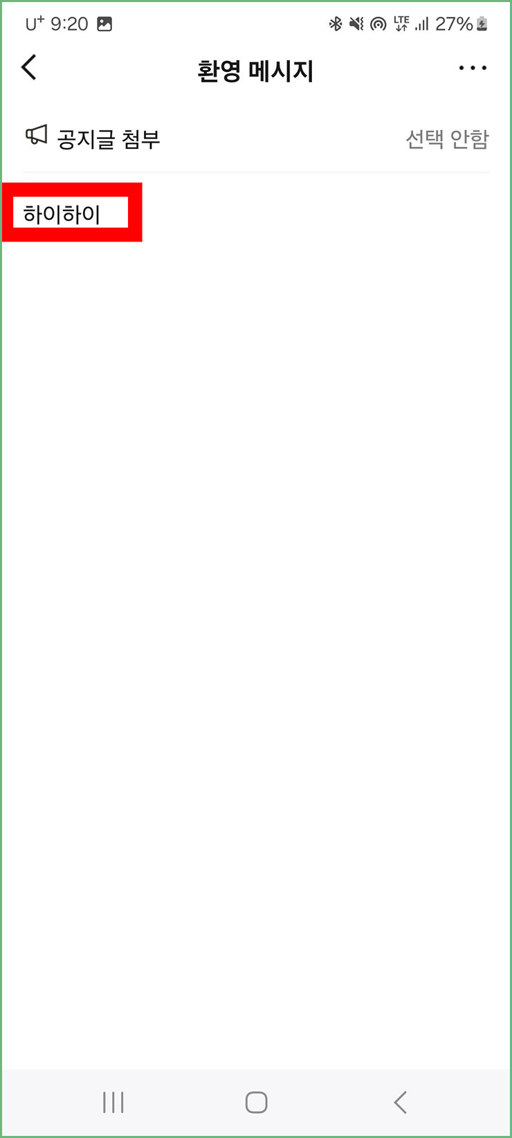 ■ 아래에 멘트가 보이면서, 누군가가 여러분들이 만든 오픈카톡에 들어오면 해당 문장이 나오면서 반겨줄 겁니다.