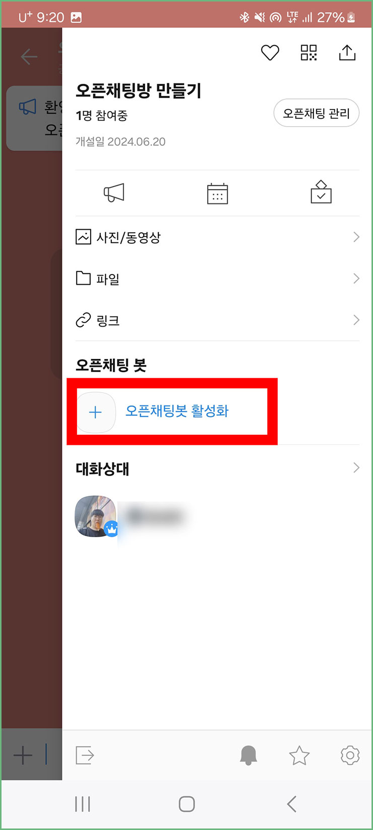 ■ 중간에 파란색 텍스트로 [오픈채팅봇 활성화]라는 텍스트가 있습니다. 해당 텍스트를 클릭해주세요.