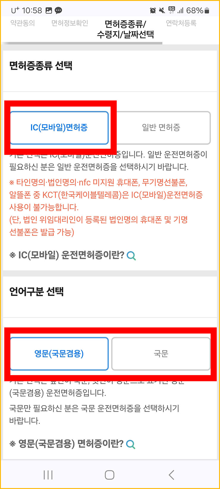 ■ [ IC(모바일)면허증 - 영문(국문겸용) ] 순으로 클릭해주세요. 우리는 온라인 버전을 발급 받기를 원하기 때문에 IC(모바일)면허증을 선택해야 합니다. 그리고 해외에 나가실 일이 많으신 분들은 영문(국문겸용)을 권장해드립니다. 그게 아니라면 국문용으로 해도 무방합니다.