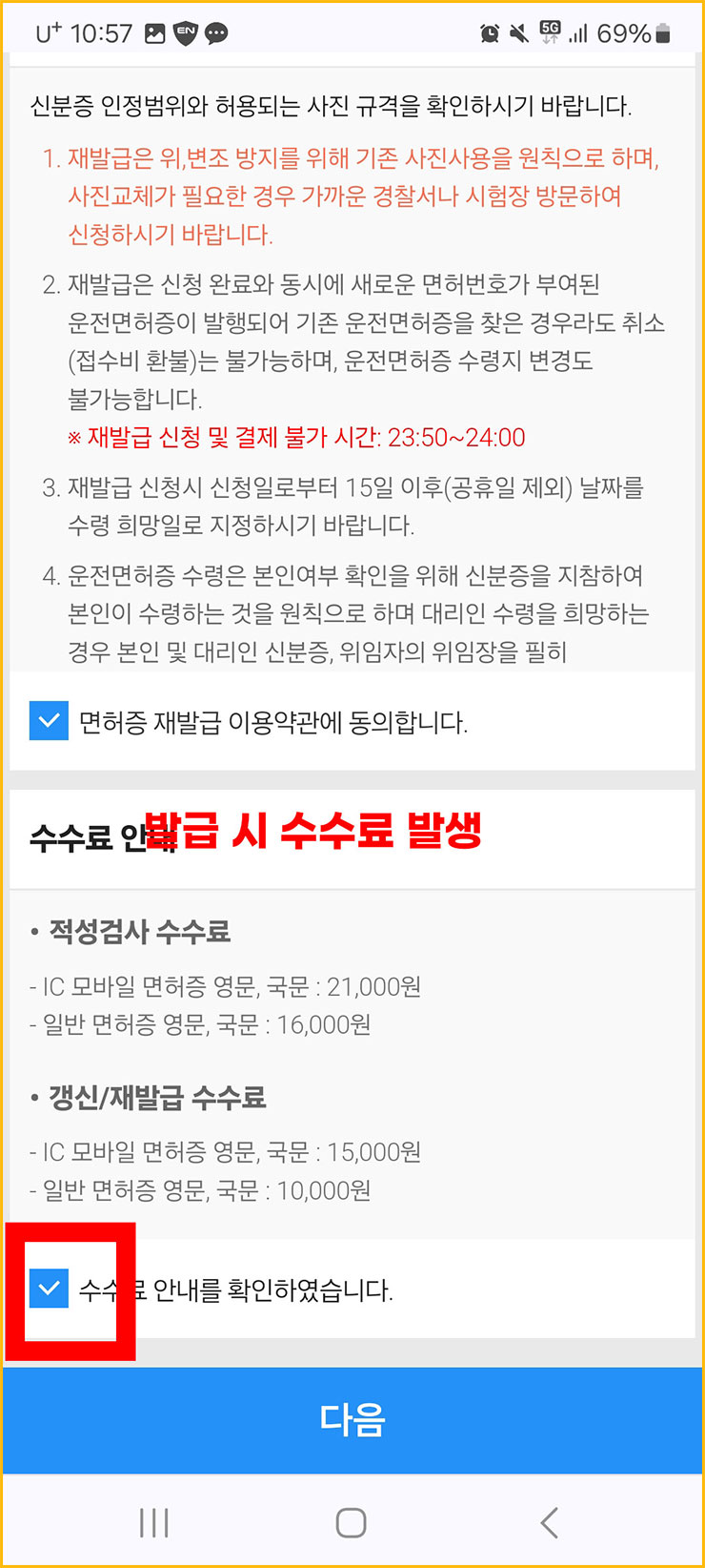 ■ 온라인 운전면허증을 발급 받기 위해서는 일정 금액을 내야 합니다. 먼저 [이용약관]에 동의를 하고, [수수료 발생]에 체크를 해주세요. 수수료는 초기에는 21,000원 / 갱신 및 재발급은 15,000원입니다.