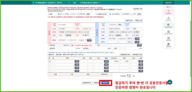 ■ <발급하기>를 누르면 한번 더 공동인증서를 인증하면 됩니다. 그러면 이제 전자세금계산서 발행 발급이 끝났습니다. 이제 새로운 거래처는 어떻게 진행하는지 확인해보겠습니다.