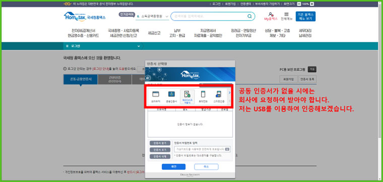 ■ 먼저 로그인하는 방법을 하나 선택해주세요. 회사에서 진행하는 경우 <공동금융인증서>로 많이 진행합니다.