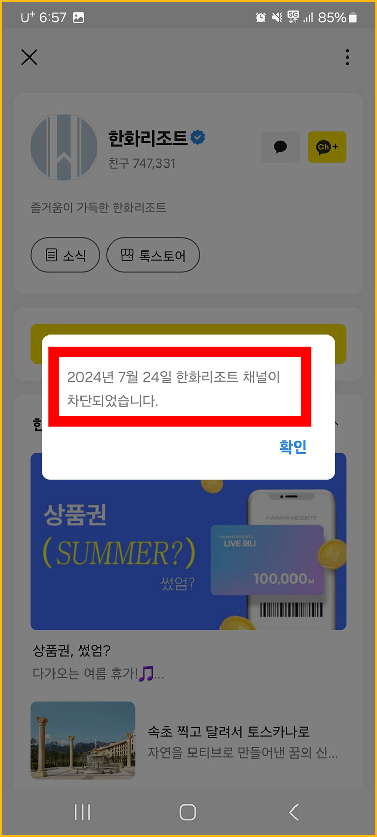 ■ 채널 차단이라는 안내창이 나옵니다. 우리는 카카오톡 광고 제거를 할 것이기 떄문에 [차단]을 클릭해주세요.