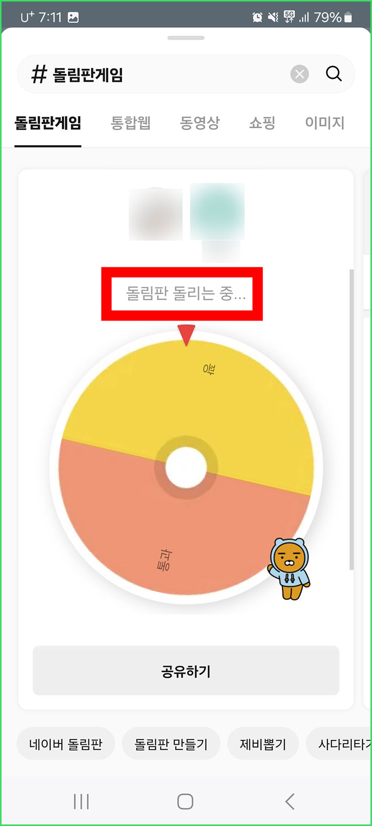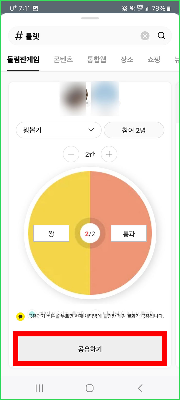 ■ 바로 돌리는 것이 아니라 [공유하기]를 누르면 방금 여러분들이 들어갔던 톡방으로 카카오톡 돌림판이 전달됩니다.