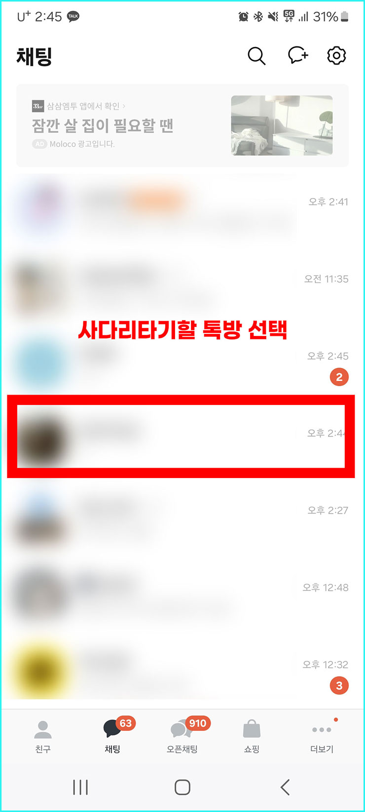 ■ 먼저 [사다리타기를 할 톡방]을 하나 클릭해주세요. 저도 제 친구에게 허락을 받고 친구 톡방에 들어가보겠습니다. 여러분들은 아마 단톡방에 들어가시겠죠?