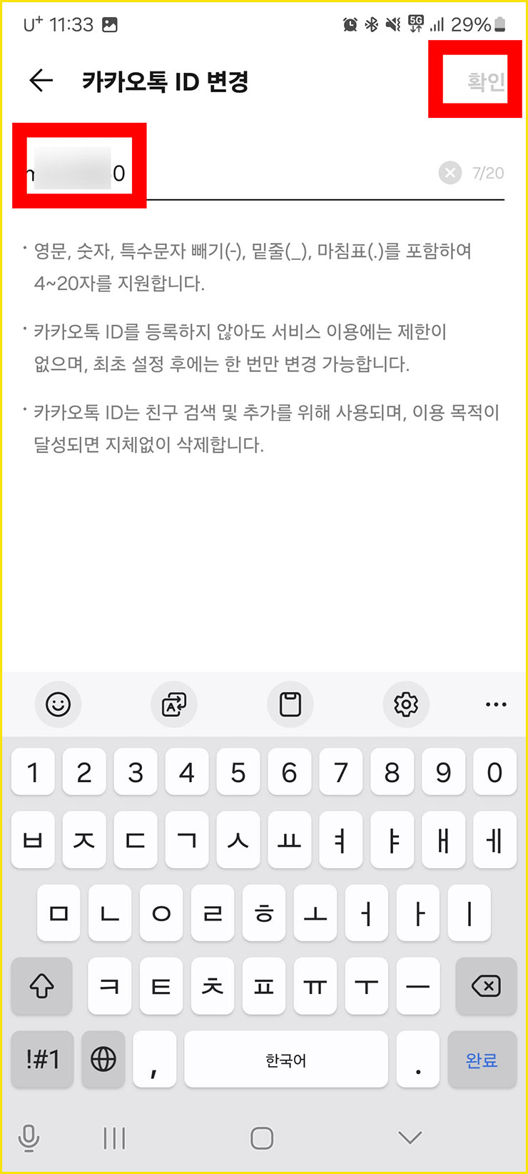 ■ 변경하고 싶은 아이디를 넣은 다음에 오른쪽 위에 있는 [확인]을 클릭하면, 이제 카카오톡 아이디 변경까지 완료되었습니다.