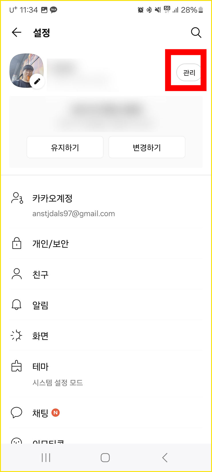 ■ 그리고 여러분들의 개인정보가 나올 겁니다. 개인정보 옆에 [관리] 텍스트가 있습니다. 텍스트를 눌러주세요.