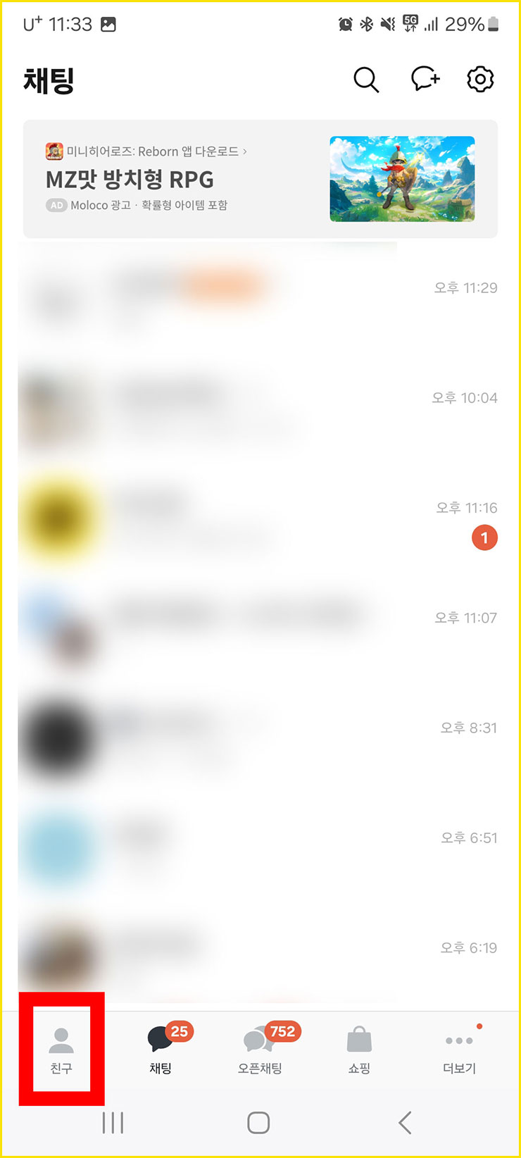 ■ 먼저 여러분들의 [카카오톡]에 들어가주세요. 그 다음에는 왼쪽 아래에 있는 [친구] 텍스트를 클릭해주세요.