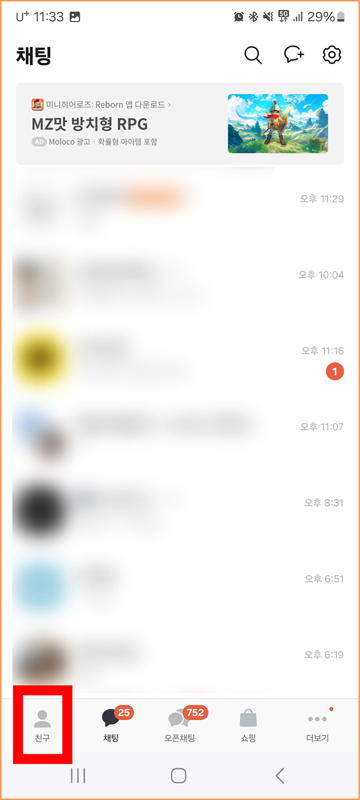 ■ 우선 [카카오톡] 어플로 들어와주세요. 그 다음에는 오른쪽 아래에 있는 [친구] 텍스트를 클릭해주세요.