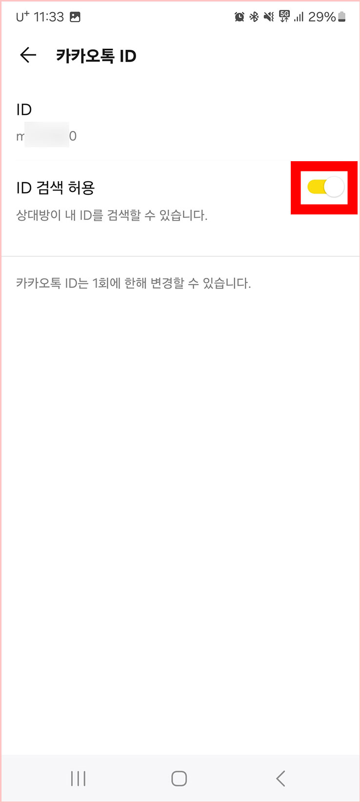 ■ [ID 검색 허용]에 노란색 버튼이 있습니다. 해당 기능을 해보신 적 없으신 분들은 보통은 ON으로 되어 있을 겁니다. 우리는 우리를 모르는 누군가가 아이디 검색을 하는 것을 막아야 하기 때문에 [노란색 버튼]을 눌러서 꺼주세요.