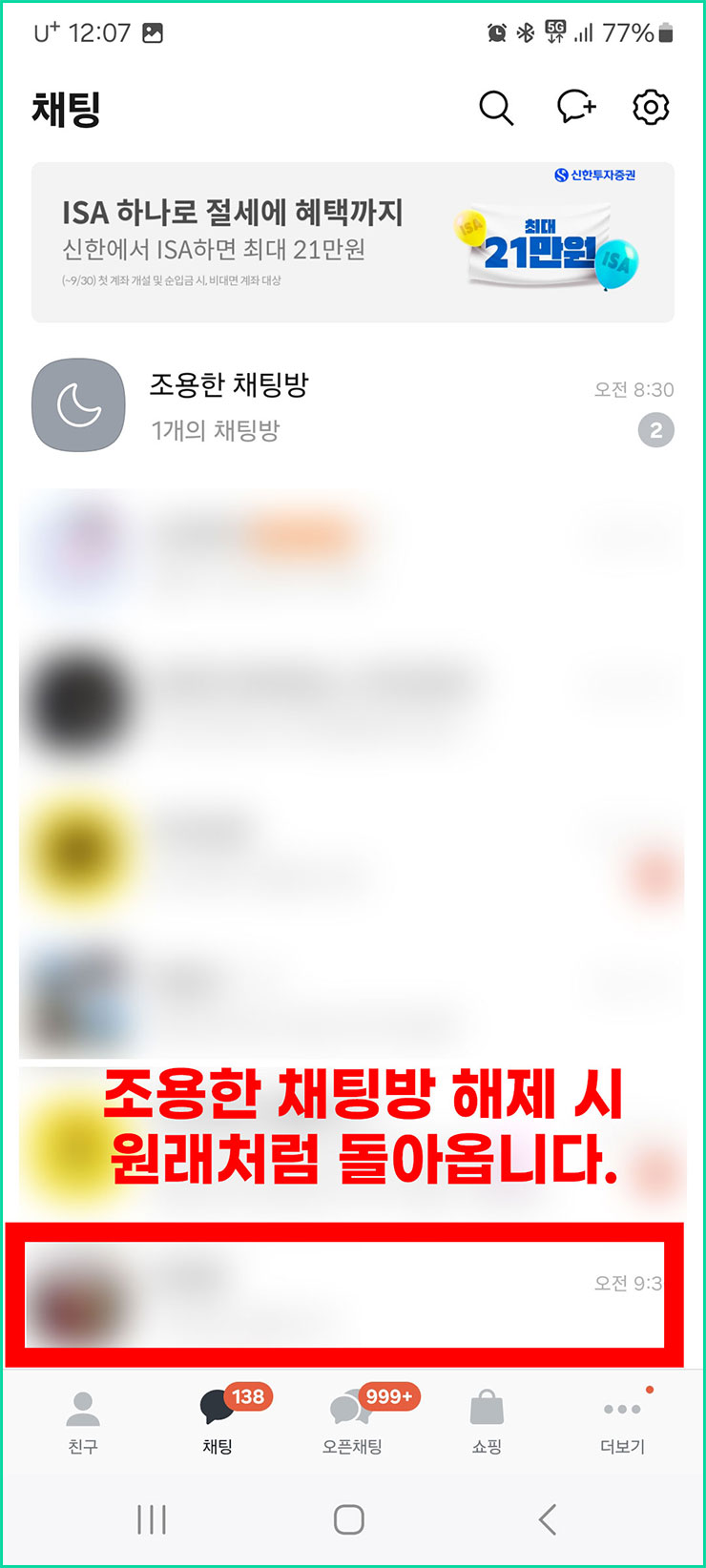 ■ 위의 과정을 걸치면 상단에 있는 조용한 채팅방 옆에 숫자가 증가한 것을 확인할 수 있습니다. 그리고 아래에는 상단에 증가한 숫자만큼 숫자가 감소한 것 또한 확인할 수 있습니다.