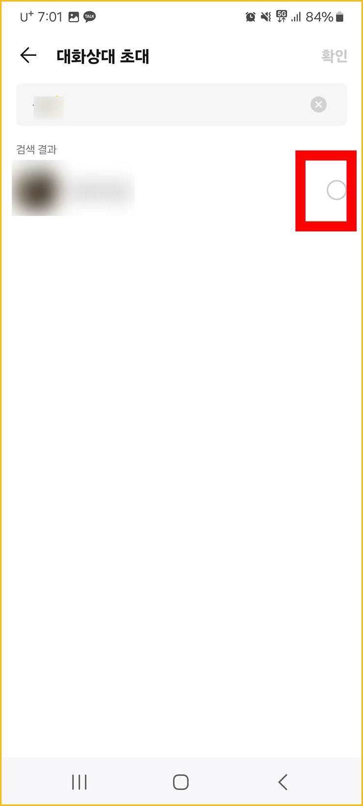 ■ 대화상대 초대 페이지가 나옵니다. [검색창]에 여러분들이 [초대할 친구의 이름]을 검색해주세요. 저도 임의의 친구 한명을 검색하였습니다.