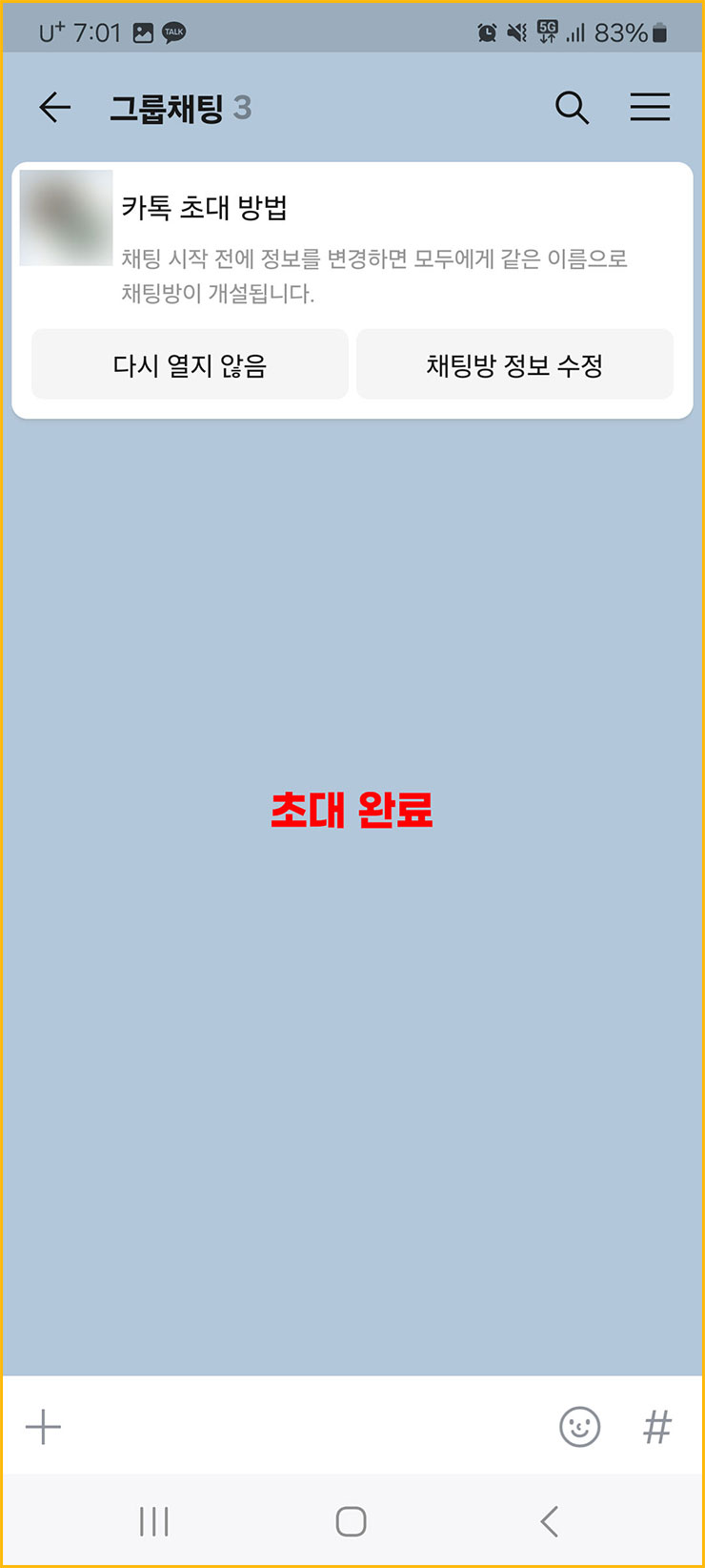 ■ 초대할 사람의 이름과 톡방명이 알맞게 들어갔다면 [확인] 버튼을 눌러주세요.