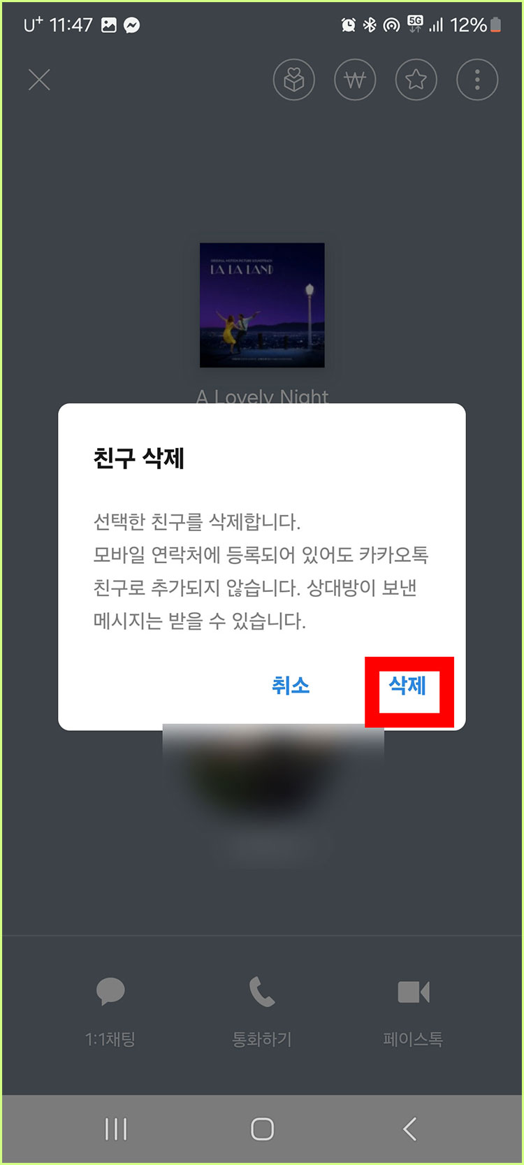 ■ 친구 삭제라는 안내창이 나옵니다. 이 상태에서 오른쪽 아래에 있는 [삭제]를 클릭해주세요.
