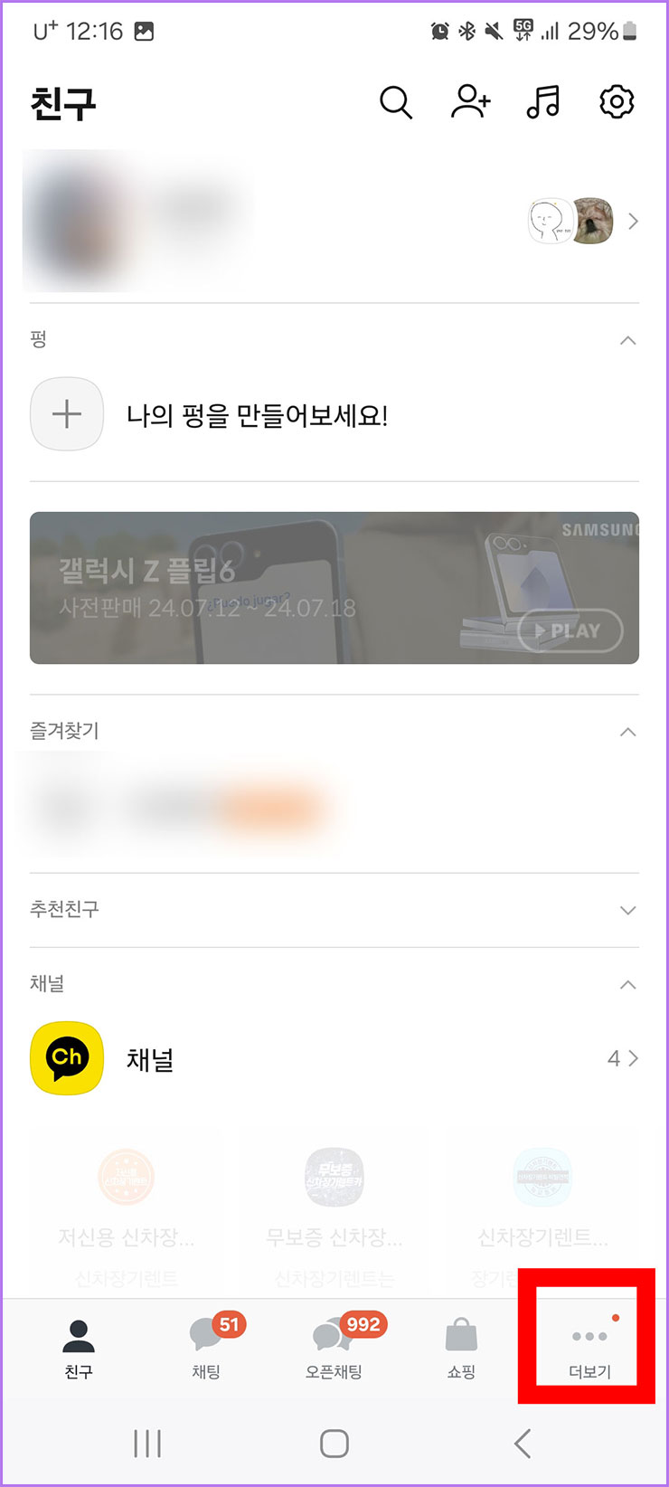 ■ 먼저 [카카오톡 어플]에 들어가주세요. 그 다음에는 페이지 아래에 있는 [더보기] 칸을 클릭해주세요.