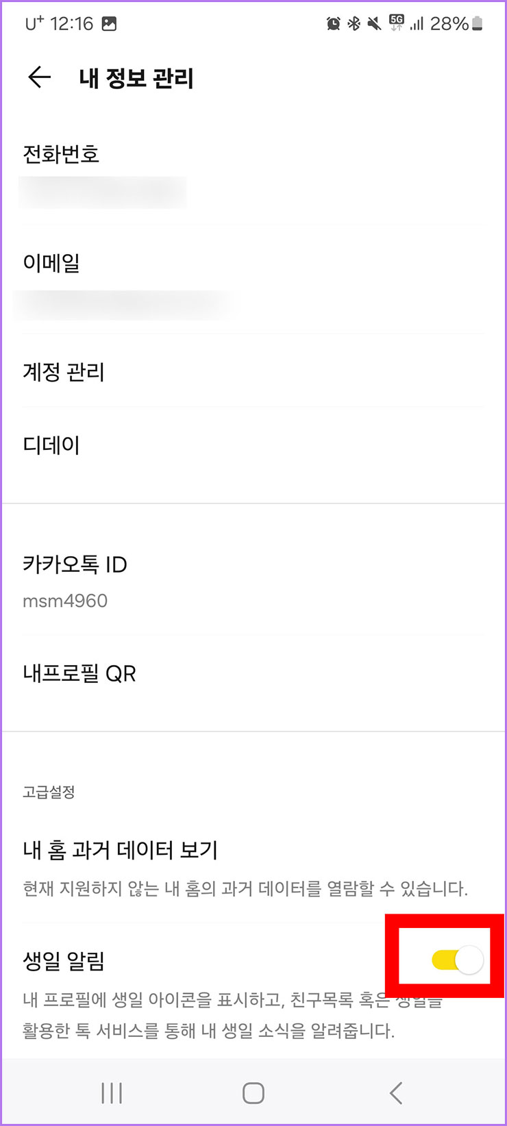 ■ 아래에 보면 [생일 알림]이라고 있습니다. 만약 이게 OFF로 되어 있으신 분들은 카카오톡 친구 생일 알람이 안 뜹니다. 저처럼 ON으로 바꿔주세요.