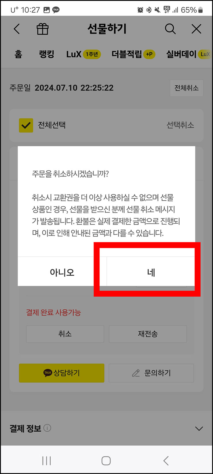 ■ [주문을 취소하시겠습니까?]라는 안내창이 나옵니다. 한번 취소를 하면 취소의 취소를 할 수 없기 때문에 여러분들께 안내를 해주는 것입니다. 그리고 취소가 된 시점에서 선물을 받은 상대방에게 취소되었다는 메시지가 나옵니다. 그렇기 때문에 한 번 더 고민을 해보시는 걸 권유해드립니다. 충분히 생각을 했다면 [네]를 클릭해주세요.