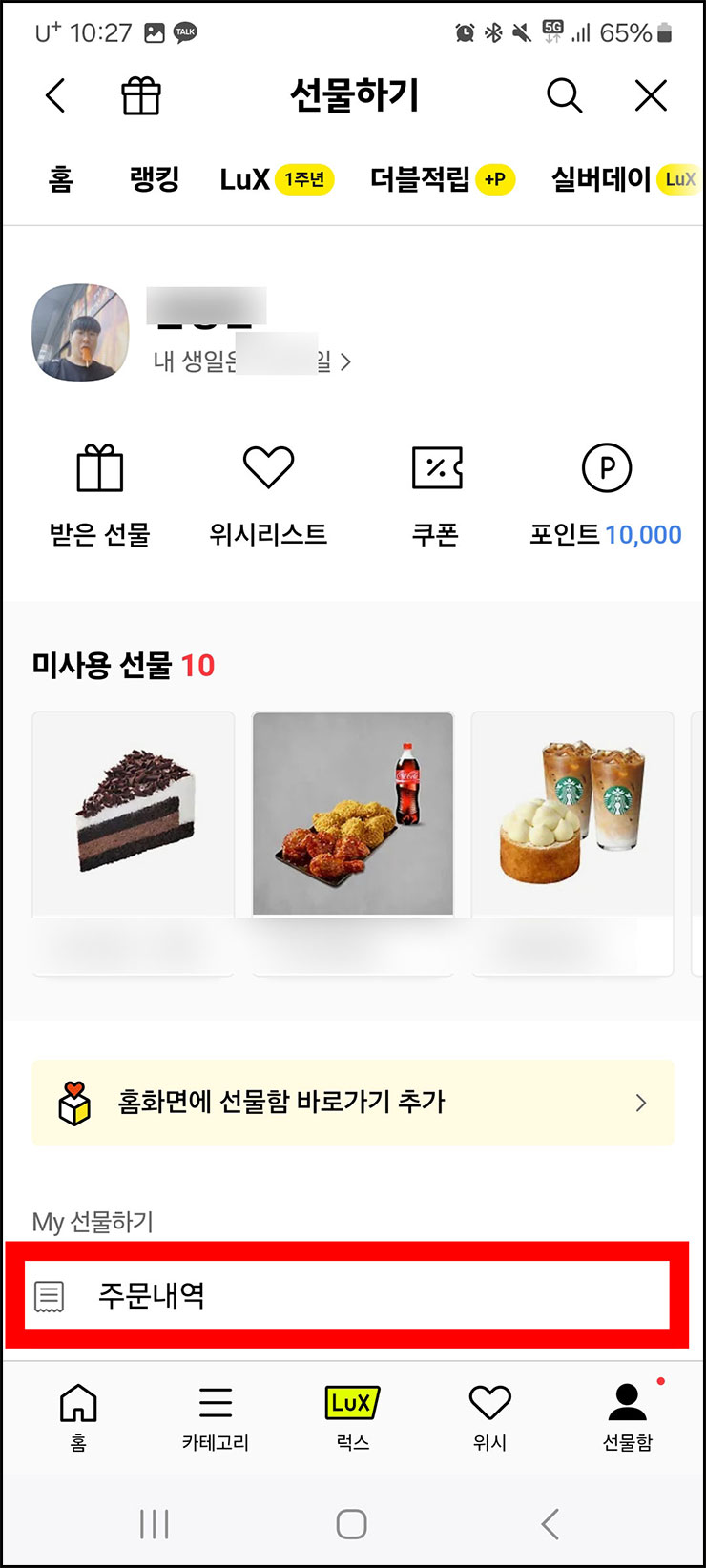 ■ 이제 우리가 샀던 선물 내역들을 확인해야 합니다. 아래 쪽에 [주문내역]이 있습니다. 주문내역을 클릭해주세요.
