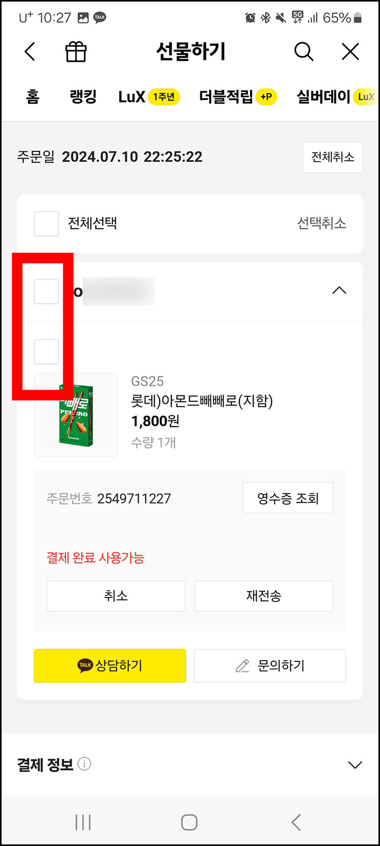 ■ 선물하기 페이지가 나옵니다. 오른쪽 아래에 있는 [선물함]이라고 적혀 있는 텍스트가 있습니다. 해당 텍스트를 클릭해주세요.