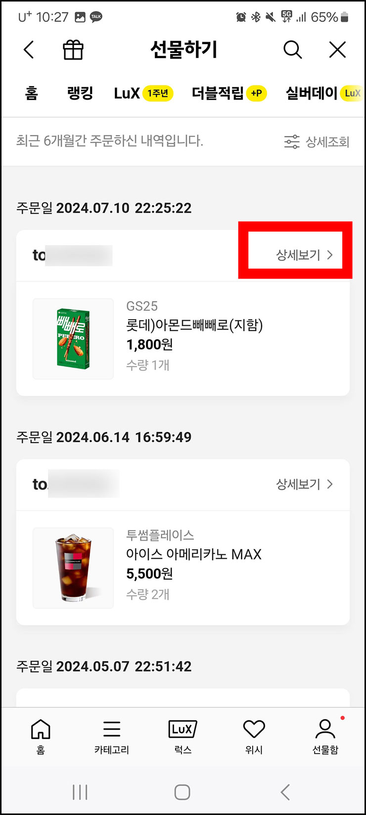 ■ 그러면 우리가 샀던 선물 상품들이 보입니다. 그 안에서 취소 및 환불하고 싶은 상품의 오른쪽 상단에 있는 [상세보기]를 클릭해주세요.