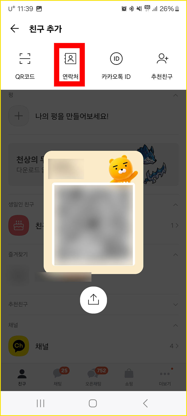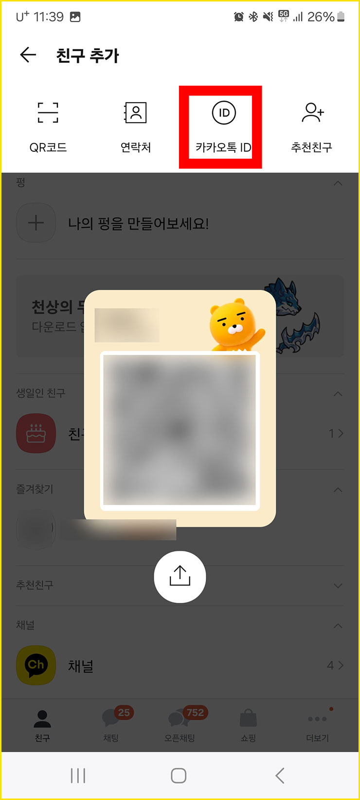 ■ 카카오톡 ID와 더불어서 많이 하는 방법이 QR코드입니다. [QR 코드]를 클릭해주세요