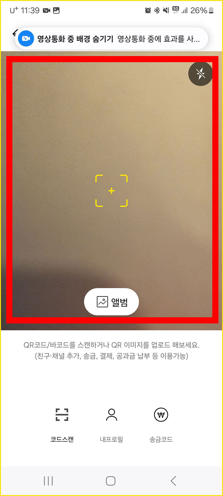 ■ [카메라] 기능이 활성화됩니다. 상대방의 QR 코드를 해당 카메라로 찍어주세요. 근데 솔직히 여기서 안 해도 되고 우리가 흔히 사용하는 핸드폰 내에 있는 QR 코드를 가지고도 촬영을 할 수가 있습니다. 마지막으로 소개해드릴 방법은 전화번호입니다.