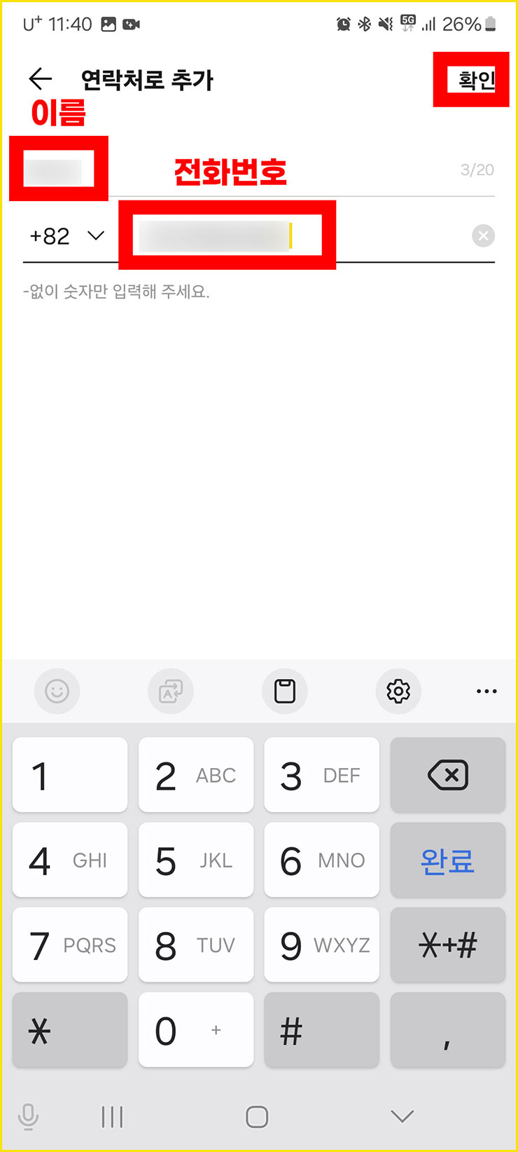 ■ 그 다음에는 여러분들이 카카오톡 친구 추가하고 싶은 사람의 [이름과 전화번호]를 입력한 다음에 [확인]을 클릭해주세요.