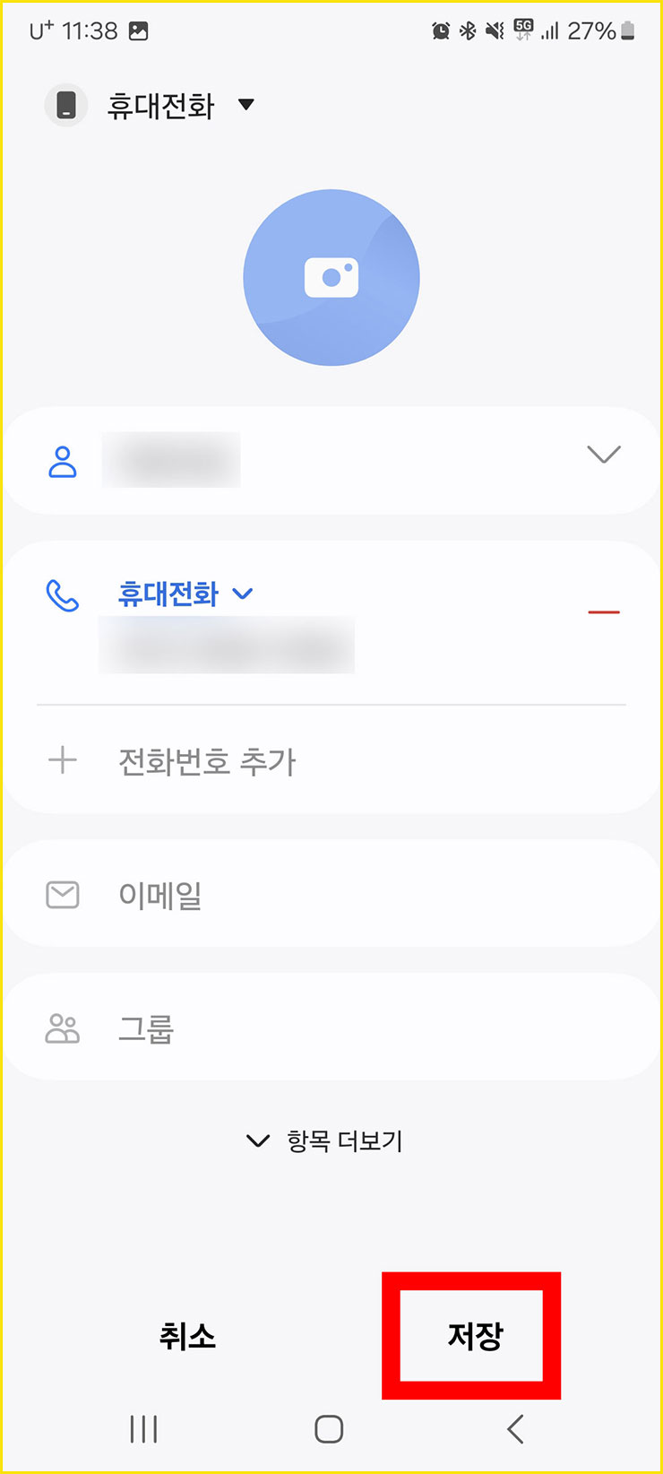 [상대방의 연락처, 전화번호]가 잘 들어갔는지 확인을 한 다음에 [저장]을 해주세요.