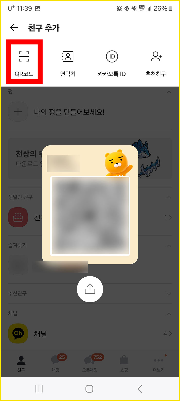 ■ 카카오톡 ID와 더불어서 많이 하는 방법이 QR코드입니다. [QR 코드]를 클릭해주세요