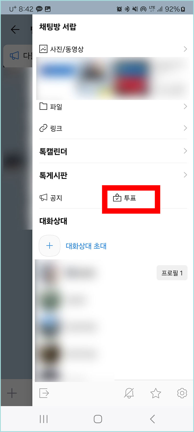 ■ 채팅방 서랍이라고 적혀 있는 페이지가 나옵니다. 우리는 카카오톡 투표 만들기를 할 것이기 때문에 가운데에 있는 [투표] 텍스트를 클릭해주세요.