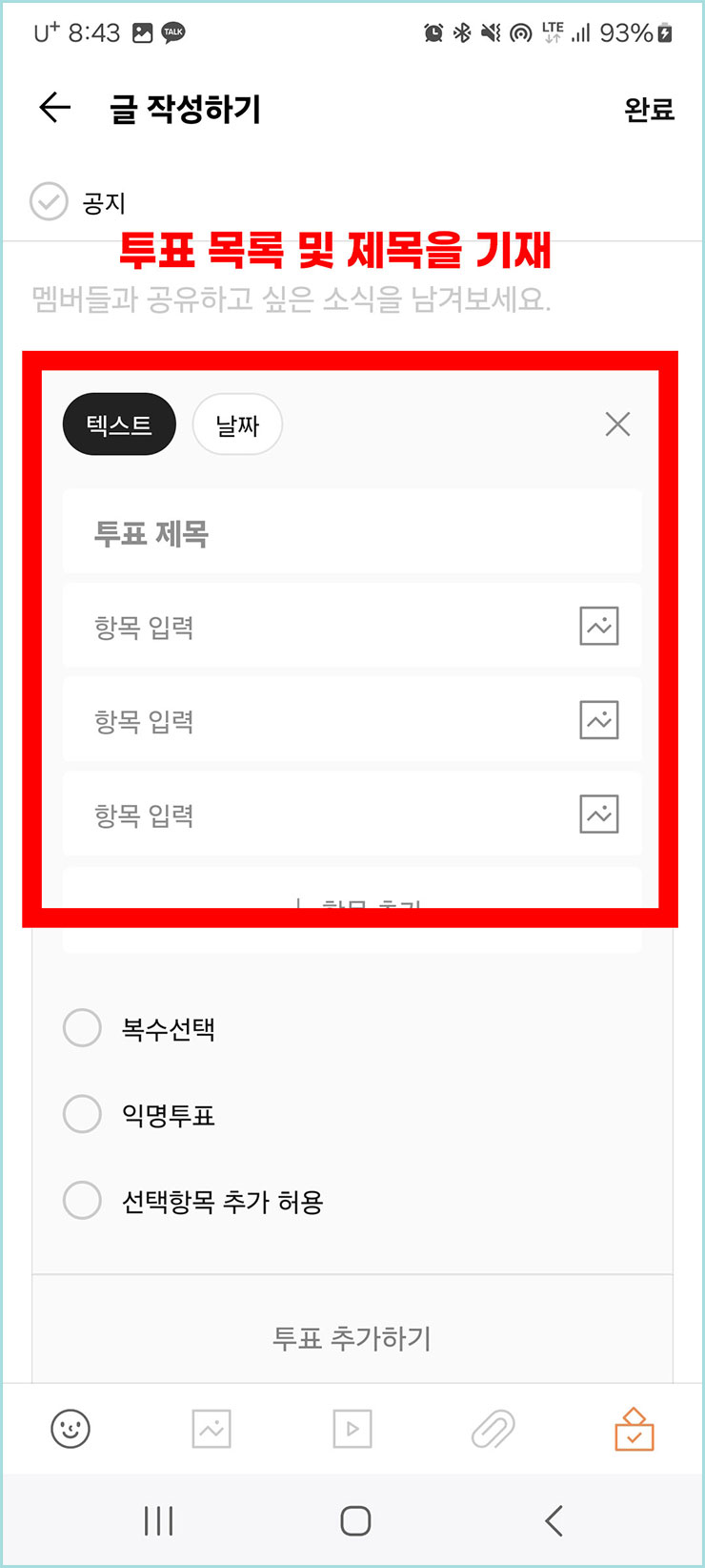 ■ 그 다음에는 추가 기능을 설정해주세요. [복수 선택 / 익명투표 / 선택항목 추가 허용] 중에서 여러분들께서 원하시는 기능을 체크해주세요. 만약에 필요없을 시에는 체크를 안 하셔도 무방합니다.