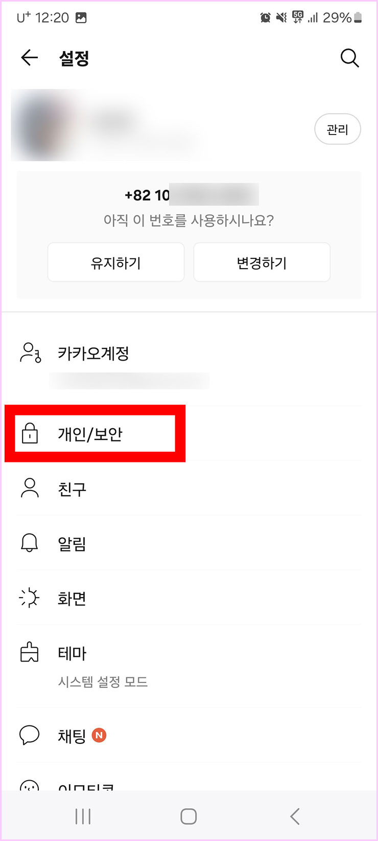 ■ 맨 위에 여러분들의 사진과 전화번호가 보일 겁니다. 그 상태에서 2번째 위치한 [개인 / 보안]을 클릭해주세요.