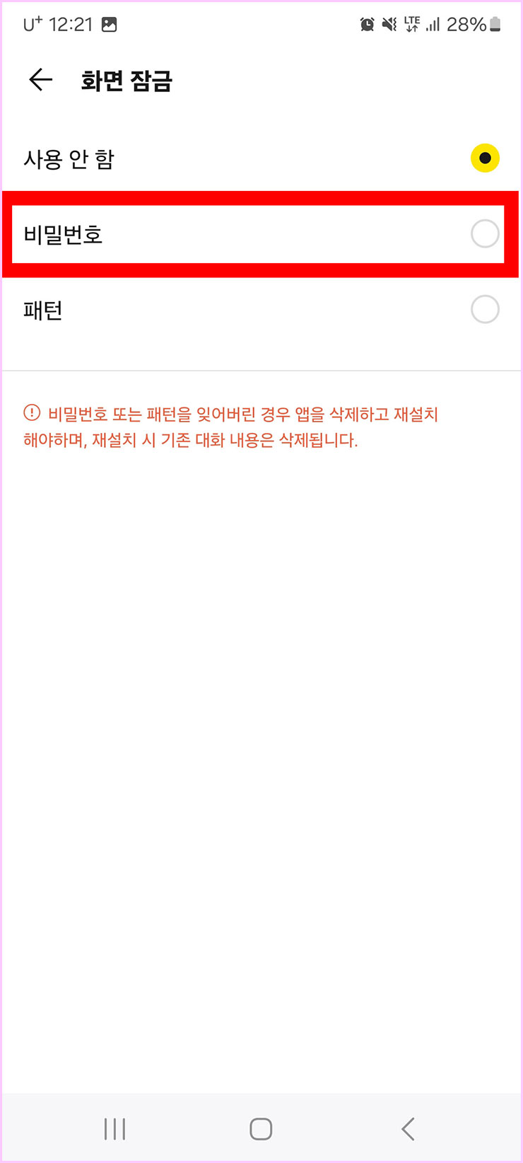 ■ 카카오톡 화면 잠금 창으로 왔습니다. 여기서 [비밀번호]를 체크해주세요. 만약에 숫자 비밀번호 말고 패턴으로 하고 싶으신 분들은 패턴으로 하셔도 무방합니다.