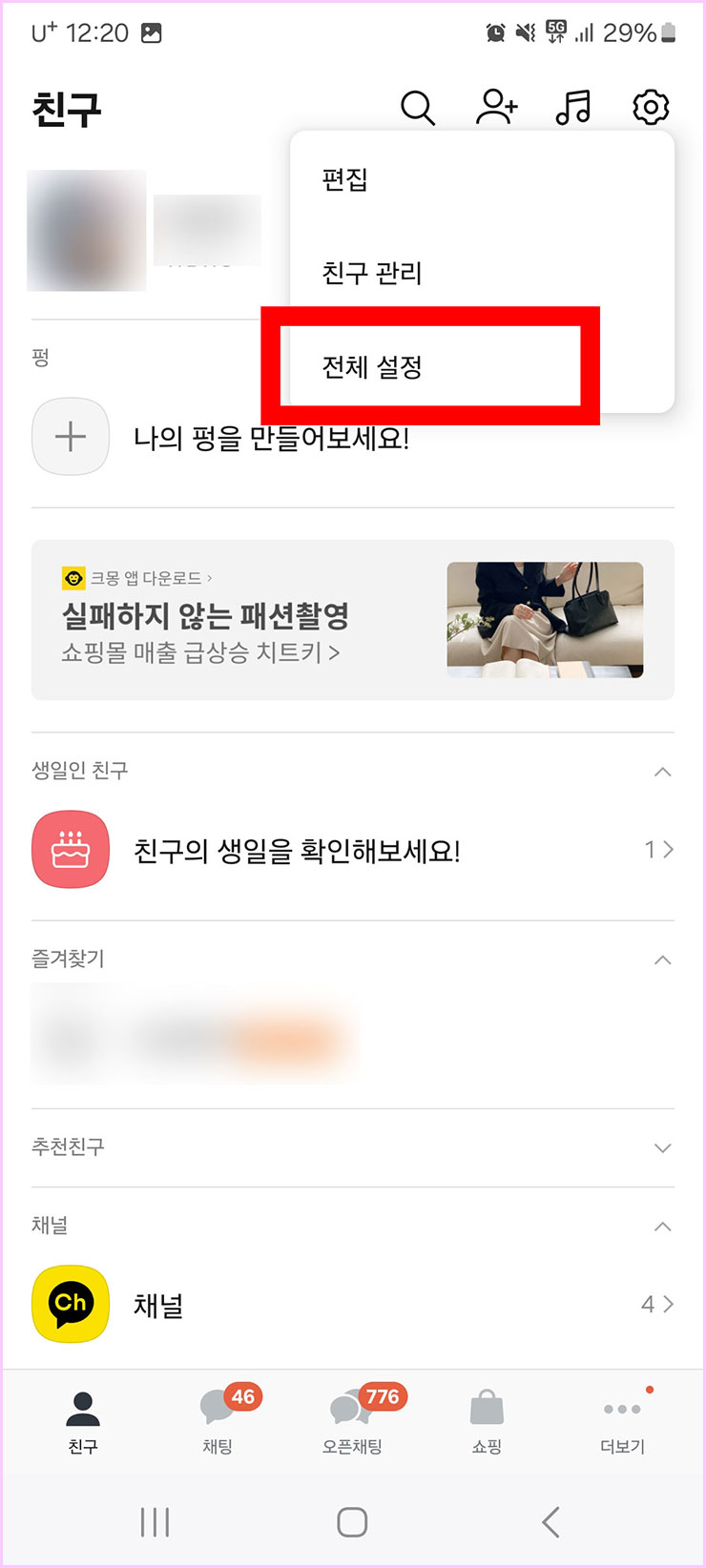 ■ 여기서 편집, 친구관리, 전체설정으로 3 가지 선택 항목이 나옵니다. 이 중에서 우리는 [전체 설정]을 클릭해주세요.