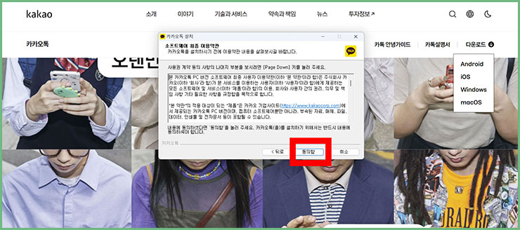 ■ 이제 여러분들의 컴퓨터에 카카오톡 PC 버전 다운로드를 하시려는 분들은 동의함을 클릭해주세요.
