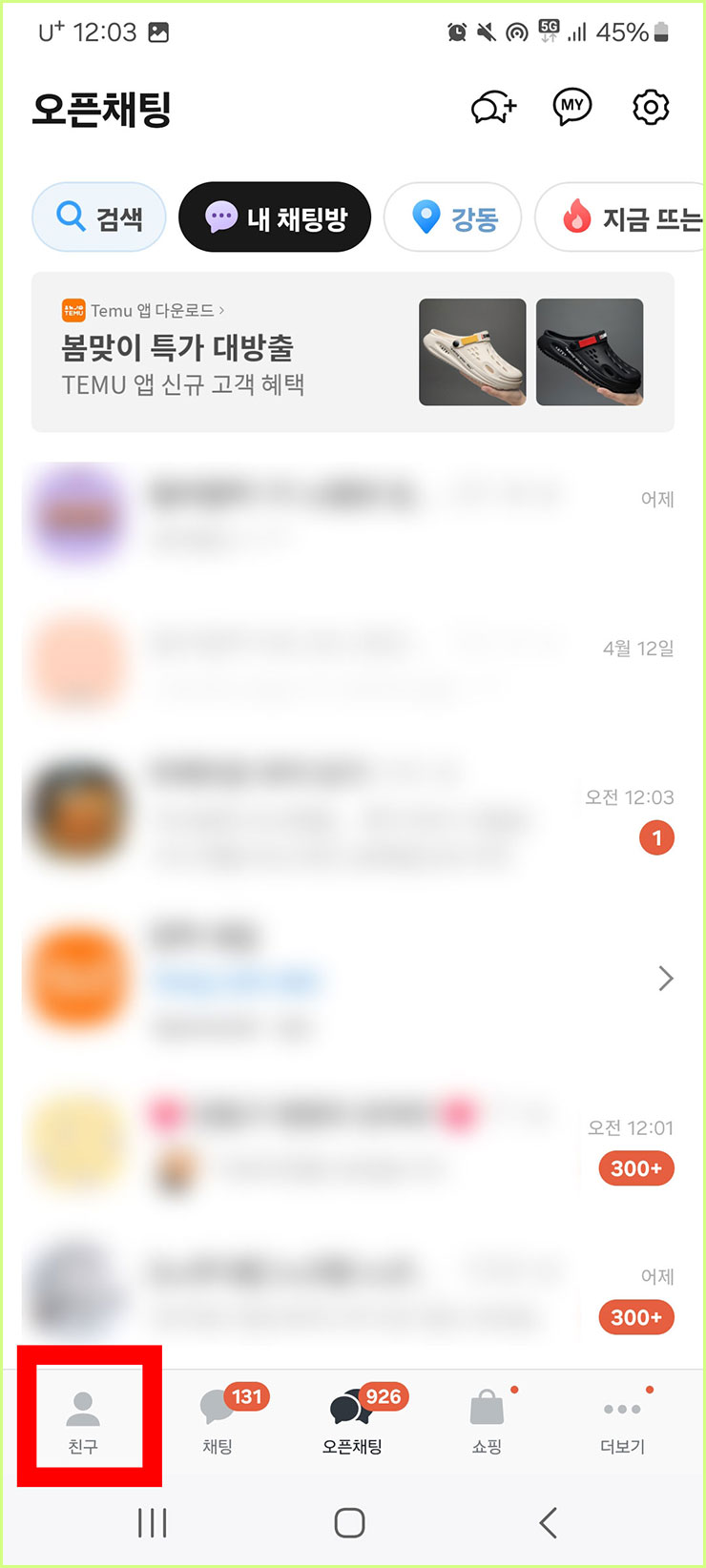 ■ 먼저 [카톡 - 친구] 순서로 클릭을 해서 들어가주세요. 보통 카톡을 열면 오픈채팅 페이지가 먼저 보입니다. 그래서 우리는 친구 아이콘을 눌러서 친구 페이지로 넘어가야 합니다.