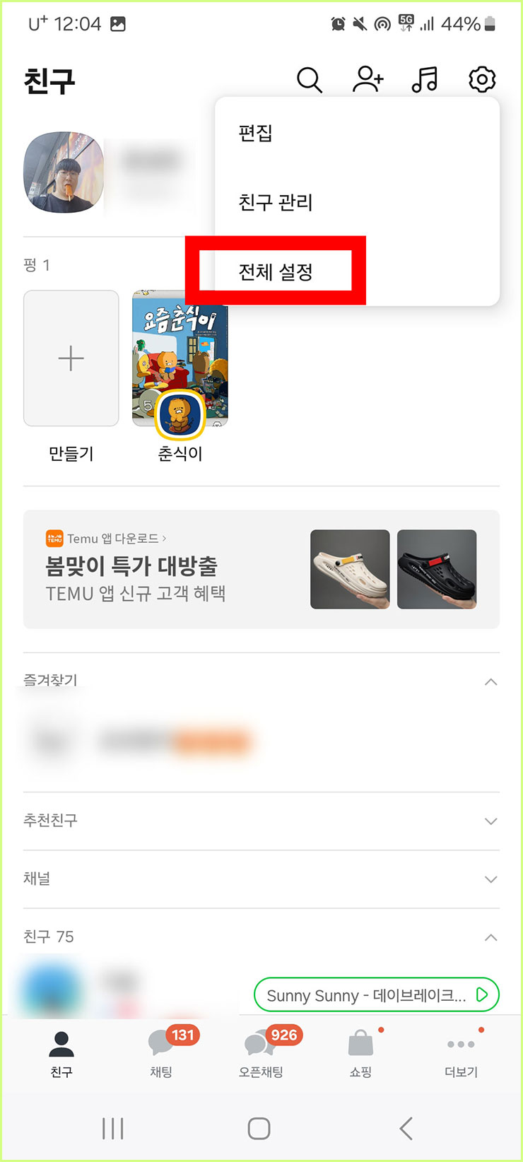 ■ 편집 / 친구관리 / 전체 설정이 보입니다. 이 중에서 3번째 위치한 [전체설정]을 클릭해주세요.