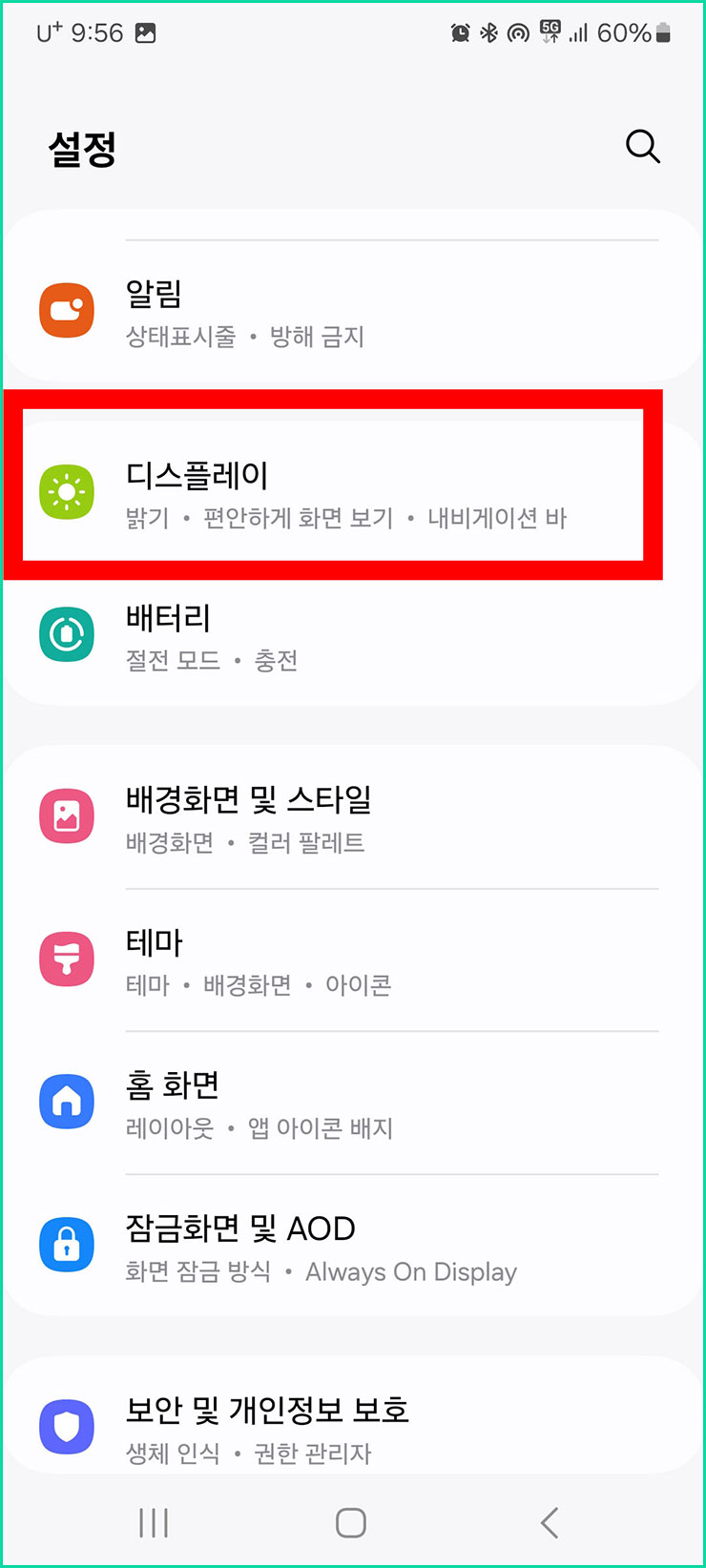 ■ 설정 페이지가 나옵니다. 설정 페이지가 나왔으면 [디스플레이] 탭을 찾아주세요. 보통 맨 위에 있지 않고,