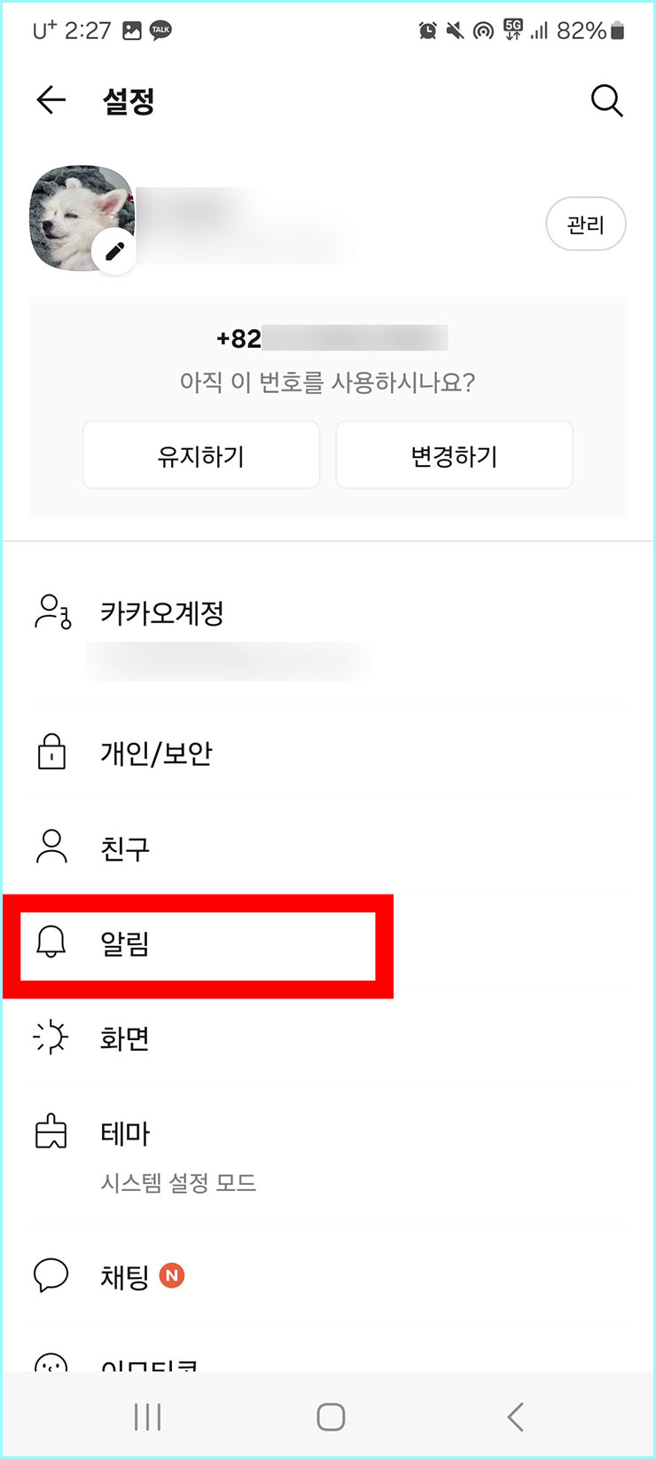 ■ 그러면 여러분들의 프로필 사진이 나오는 설정창이 나옵니다. 이 상태에서 중간에 보면 [알림] 항목이 있습니다. 해당 항목을 클릭해주세요.