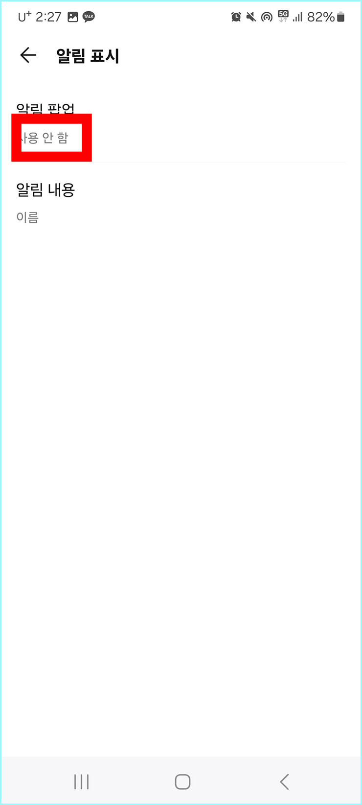 ■ 알림 표시를 하면 알림 팝업 / 알림 내용, 크게 2가지 선택사항이 나옵니다. 이 중에서 [알림 팝업]을 클릭해주세요.