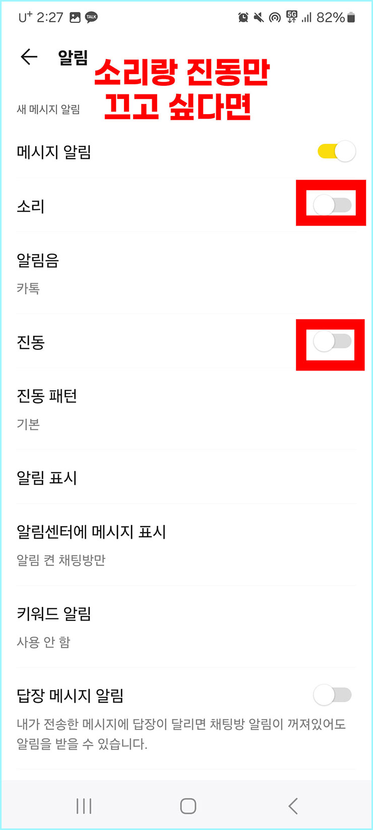 ■ 소리랑 진동만 안 나오게 하고 싶다면 메시지 알림 버튼은 활성화 한 상태에서 [소리 / 진동] 항목만 버튼을 클릭해서 비활성화해주세요.