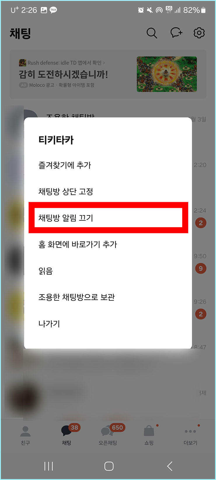 ■ 길게 누르고 나면 아래와 같이 안내창이 나옵니다. 안내창에 보면 세 번째 항목에 [채팅방 알림 끄기]라는 항목 있습니다. 해당 항목을 클릭해주세요.