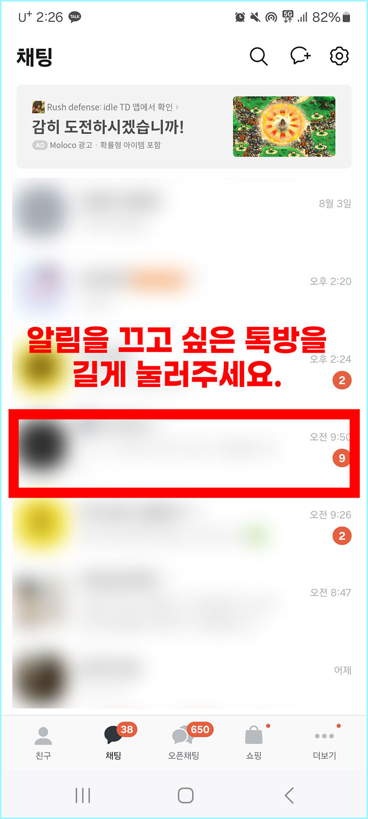 ■ 제일 간단한 방법을 먼저 여러분들께 소개해드리겠습니다. 먼저 알림을 끄고 싶은 카톡방을 [길게] 눌러주세요.
