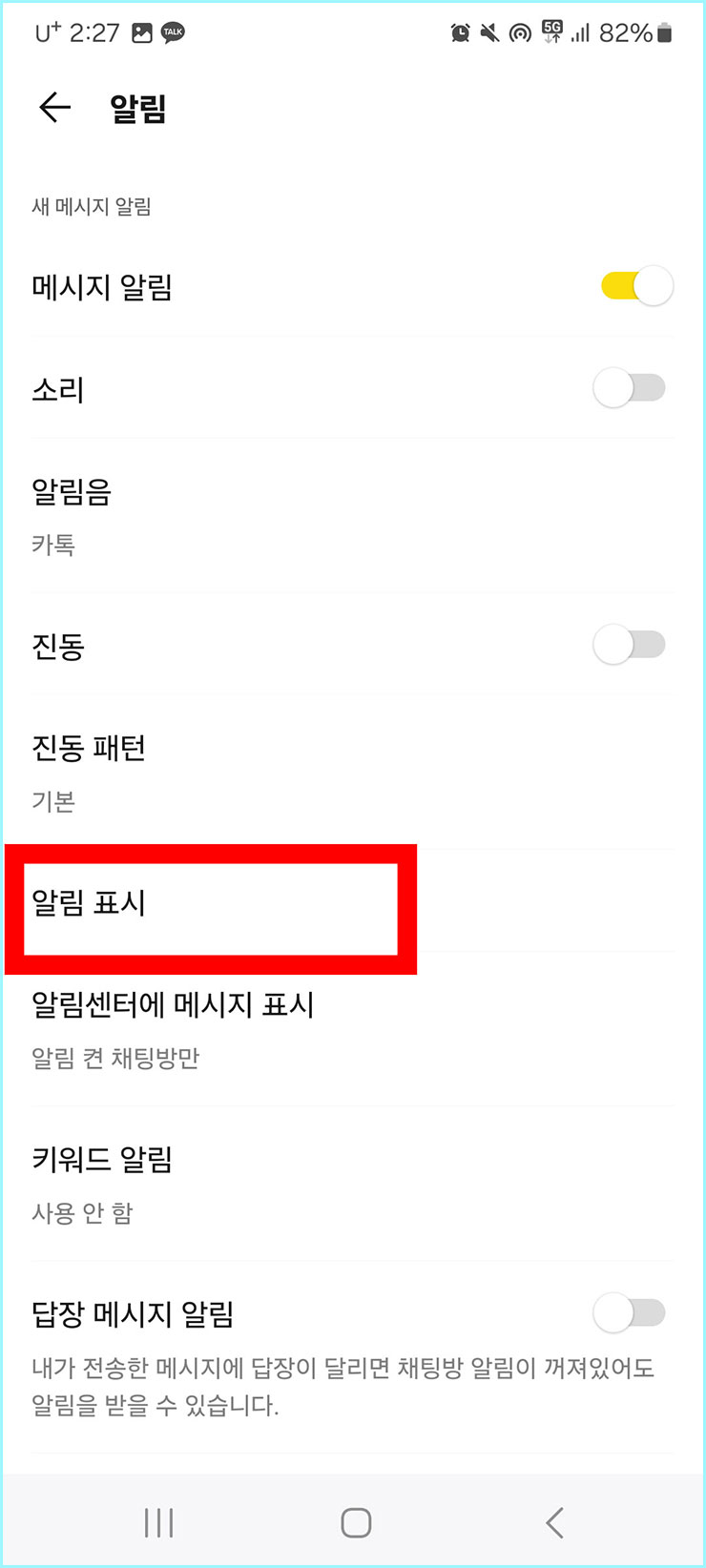 ■ 화면에 카톡 팝업창이 나오는 게 싫으신 분들도 계실 겁니다. 그럴 때는 [알림 표시] 항목을 클릭해주세요.
