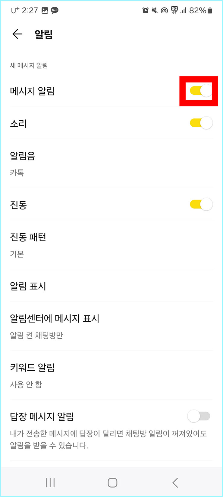 ■ 이번 챕터에서는 전체적으로 끄기를 설정하는 것이기 때문에, [메시지 알림] 옆에 버튼을 클릭해서 off 해주세요.